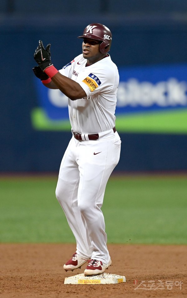 31일 서울 고척스카이돔에서 ‘2022 신한은행 MY CAR KBO리그’ 롯데 자이언츠와 키움 히어로즈 경기가 열렸다. 3회말 1사 2루 키움 푸이그가 역전 1타점 중전 2루타를 치고 2루에서 기뻐하고 있다.