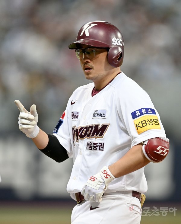 31일 서울 고척스카이돔에서 ‘2022 신한은행 MY CAR KBO리그’ 롯데 자이언츠와 키움 히어로즈 경기가 열렸다. 3회말 무사 키움 이지영이 좌전 안타를 치고 1루에서 기뻐하고 있다.
