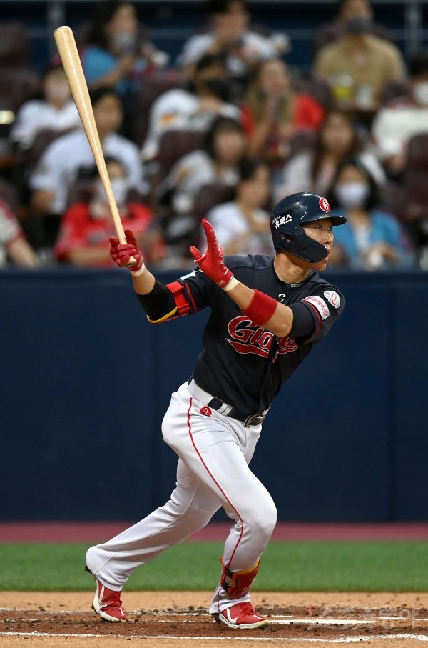 31일 서울 고척스카이돔에서 ‘2022 신한은행 MY CAR KBO리그’ 롯데 자이언츠와 키움 히어로즈 경기가 열렸다. 2회초 2사 2루 롯데 박승욱이 1타점 우전 안타를 치고 있다.