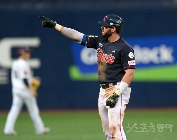 31일 서울 고척스카이돔에서 ‘2022 신한은행 MY CAR KBO리그’ 롯데 자이언츠와 키움 히어로즈 경기가 열렸다. 7회초 무사 롯데 렉스가 중전 2루타를 치고 2루에서 기뻐하고 있다.