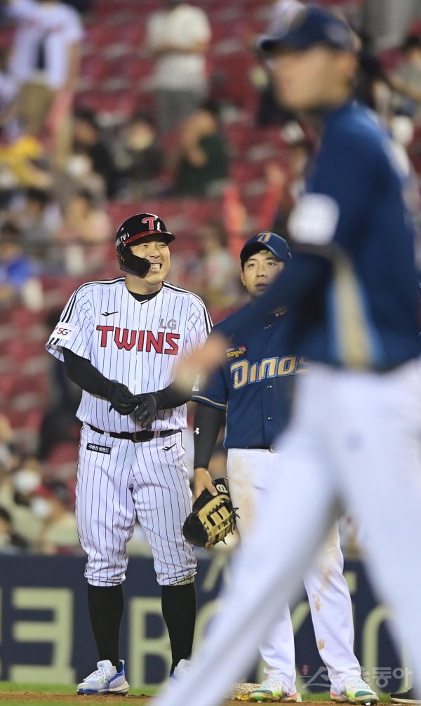 31일 서울 잠실야구장에서 열린 ‘2022 신한은행 SOL KBO리그’ LG 트윈스와 NC 다이노스의 경기에서 7회말 2사 2루 LG 김현수가 1타점 중전 적시타를 친 후 기뻐하고 있다.