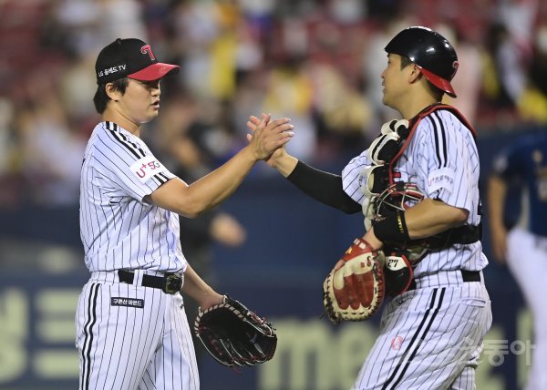 31일 서울 잠실야구장에서 열린 ‘2022 신한은행 SOL KBO리그’ LG 트윈스와 NC 다이노스의 경기에서 NC에 5-3으로 승리한 LG 고우석과 유강남이 하이파이브를 하고 있다.