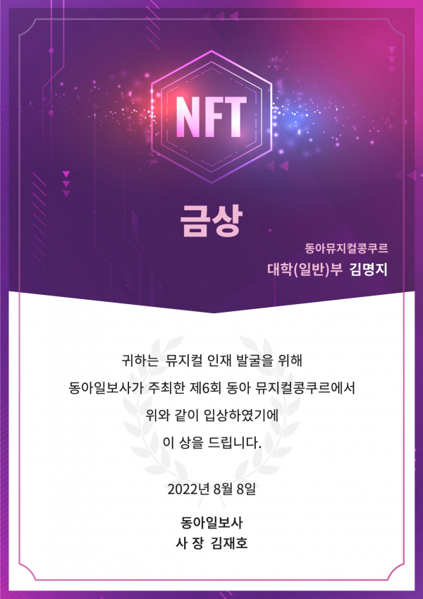 동아일보사가 주최한 제6회 동아뮤지컬콩쿠르가 수상자들에게 NFT 상장을 수여했다고 31일 밝혔다. 동아일보사는 블록체인 및 AI 기반의 NFT 플랫폼 솔루션 기업인 모핑아이와 협력해 종이상장과 별도로 NFT 상장을 제작했으며 수상자 총 45명 중 39명의 신청을 받아 수여했다. 모핑아이는 과학기술정보통신부와 한국인터넷진흥원(KISA)의 블록체인 민간분야 시범사업 주관업체로 선정된 업체로 NFT몰 및 공연예술 NFT 전시·구독 서비스 시범 운영의 일환으로 이번 사업을 진행했다.