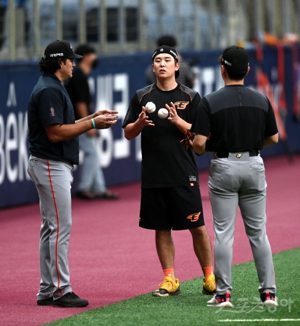 1일 서울 고척스카이돔에서 ‘2022 신한은행 MY CAR KBO리그’ 한화 이글스와 키움 히어로즈 경기가 열린다. 한화 수베로 감독이 정은원에게 훈련에 대해 이야기하고 있다.