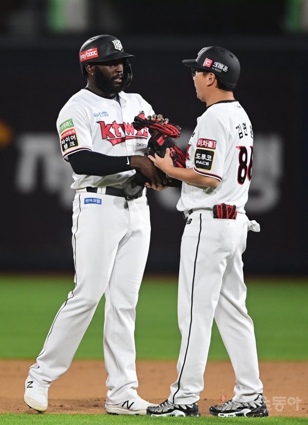 1일 경기도 수원KT위즈파크에서 열린 ‘2022 신한은행 SOL KBO리그’ KT 위즈와 LG 트윈스의 경기에서 3회말 2사 KT 알포드가 좌전 2루타를 친 후 1루코치에게 보호 장비를 주고 있다.