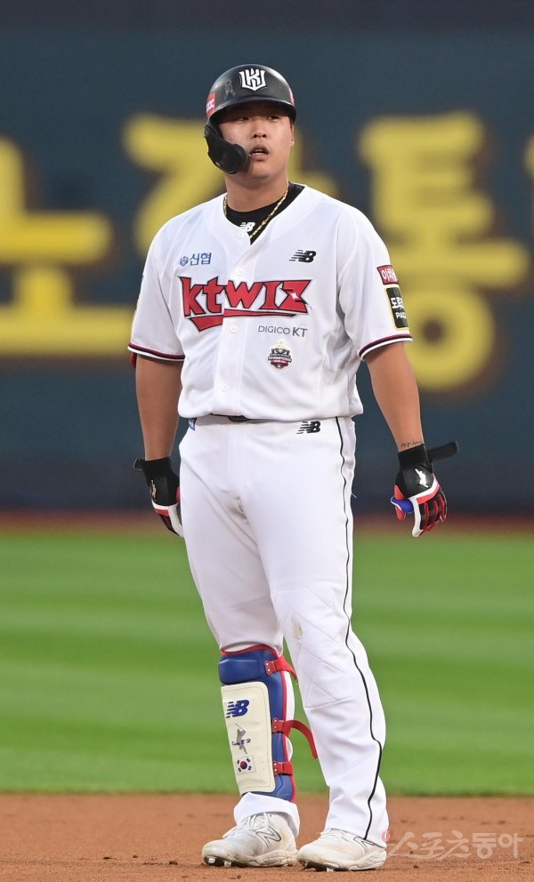 1일 경기도 수원KT위즈파크에서 열린 ‘2022 신한은행 SOL KBO리그’ KT 위즈와 LG 트윈스의 경기에서 1회말 2사 KT 강백호가 좌전 2루타를 쳤지만 비디오판독 결과 파울 선언에 아쉬워하고 있다.