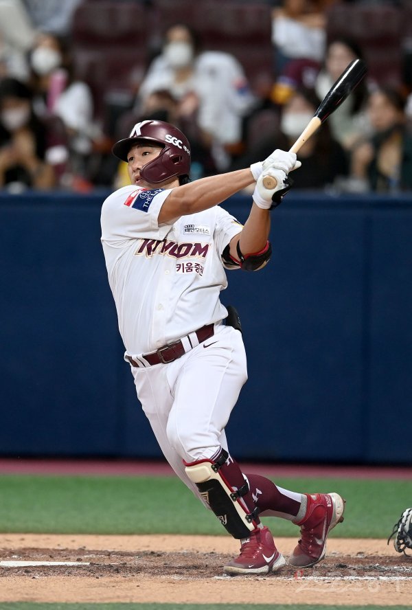 1일 서울 고척스카이돔에서 ‘2022 신한은행 MY CAR KBO리그’ 한화 이글스와 키움 히어로즈 경기가 열렸다. 2회말 2사 키움 임지열이 좌전 2루타를 치고 있다.