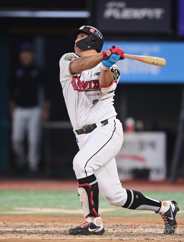 1일 경기도 수원KT위즈파크에서 열린 ‘2022 신한은행 SOL KBO리그’ KT 위즈와 LG 트윈스의 경기에서 7회초 무사 KT 황재균이 솔로 홈런을 치고 있다.