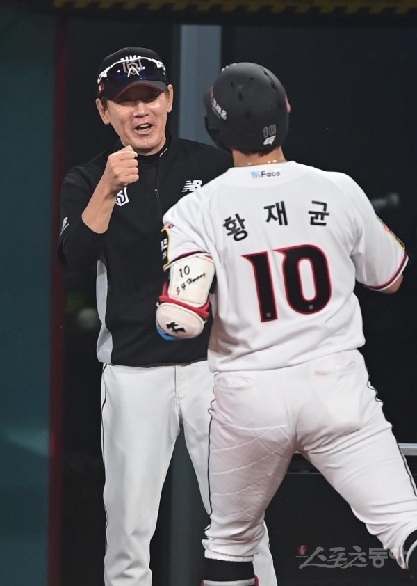 1일 경기도 수원KT위즈파크에서 열린 ‘2022 신한은행 SOL KBO리그’ KT 위즈와 LG 트윈스의 경기에서 7회초 무사 KT 황재균이 솔로 홈런을 친 후 이강철 감독의 축하를 받고 있다.
