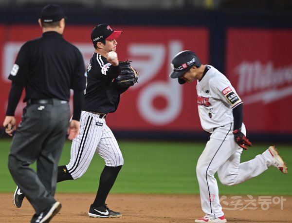 1일 경기도 수원KT위즈파크에서 열린 ‘2022 신한은행 SOL KBO리그’ KT 위즈와 LG 트윈스의 경기에서 8회말 1사 1루 KT의 내야 땅볼 때 LG 오지환이 1루주자를 포스 아웃시킨 후 1루로 송구하고 있다.