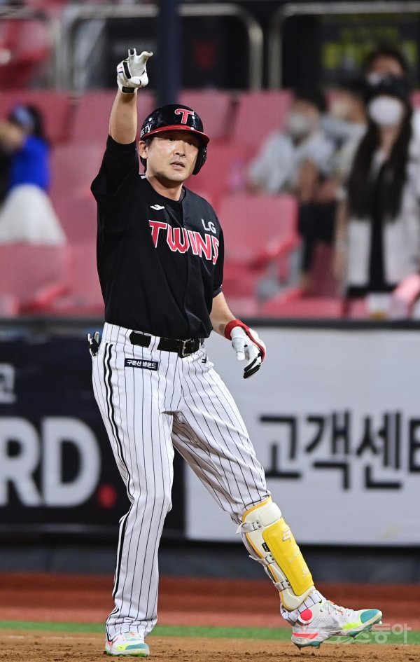 1일 경기도 수원KT위즈파크에서 열린 ‘2022 신한은행 SOL KBO리그’ KT 위즈와 LG 트윈스의 경기에서 9회초 2사 2, 3루 LG 이형종이 역전 2타점 적시타를 친 후 더그아웃을 향해 세리머니하고 있다.