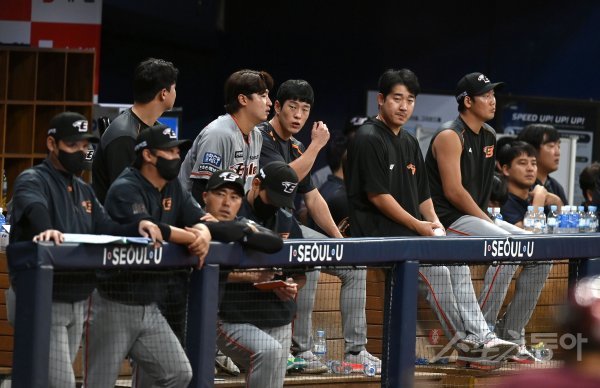 1일 서울 고척스카이돔에서 ‘2022 신한은행 MY CAR KBO리그’ 한화 이글스와 키움 히어로즈 경기가 열렸다. 1-7로 패하며 4연패에 빠진 한화 선수들이 9회초 공격을 바라보고 있다.