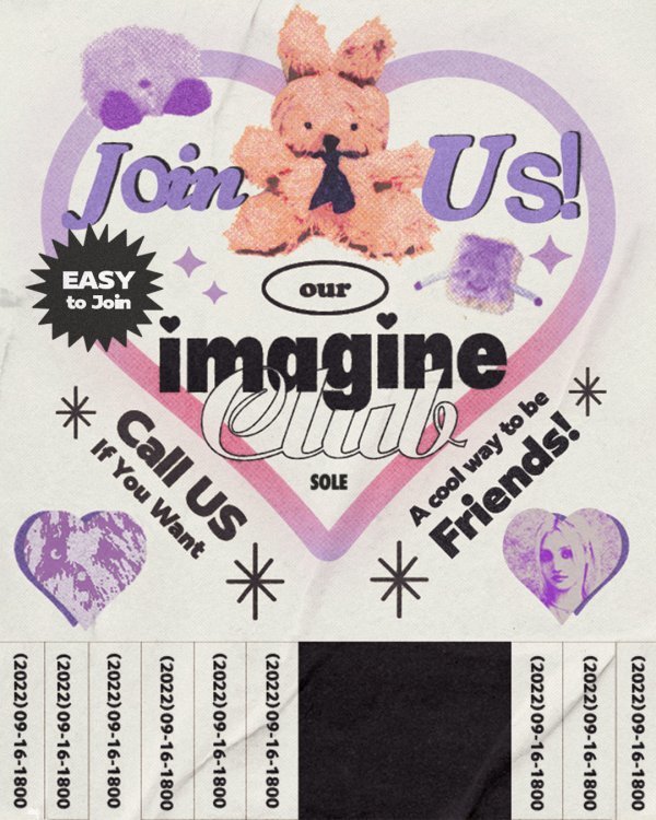 키치한 포스터 디자인의 티저 이미지는 정규앨범명인 'imagine club'과 발매일시를 비롯해 'Join Us!', 'EASY to Join', 'Call US If You Want', 'A cool way to be Friends!' 등의 문구를 담고 있다.