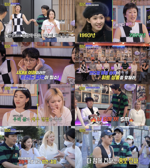 먼저 홍진경, 김숙, 조세호, 주우재, 우영과 차태현, 정연, 지효는 자신의 20대 의상과 메이크업으로 스튜디오에 등장해 웃음을 자아냈다.