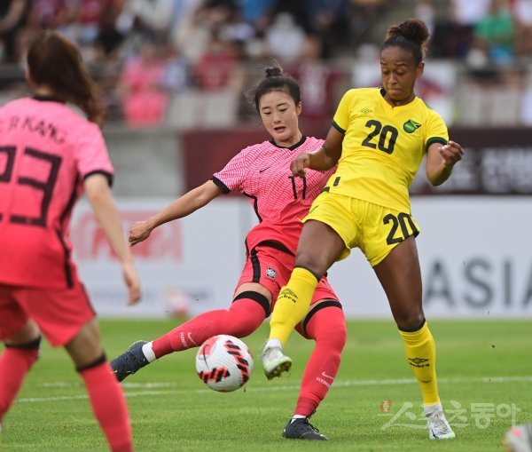 3일 경기도 화성종합경기타운에서 열린 ‘신세계 이마트 초청 여자축구국가대표팀 친선경기’ 한국과 자메이카의 경기에서 한국 최유리가 자메이카 프리머스 앞에서 슛을 하고 있다.