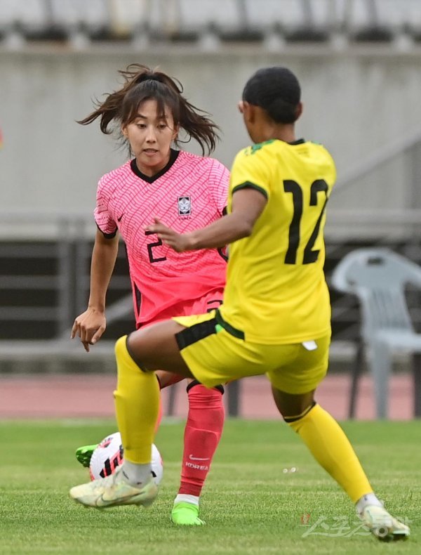 3일 경기도 화성종합경기타운에서 열린 ‘신세계 이마트 초청 여자축구국가대표팀 친선경기’ 한국과 자메이카의 경기에서 한국 추효주가 자메이카 수비 앞에서 패스를 하고 있다.