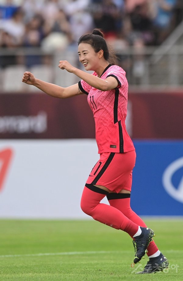 3일 경기도 화성종합경기타운에서 열린 ‘신세계 이마트 초청 여자축구국가대표팀 친선경기’ 한국과 자메이카의 경기에서 한국 최유리가 선제골을 성공시킨 후 세리머니를 하고 있다.