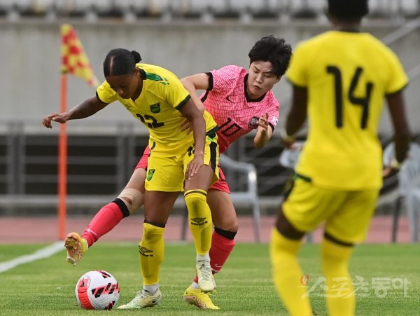 3일 경기도 화성종합경기타운에서 열린 ‘신세계 이마트 초청 여자축구국가대표팀 친선경기’ 한국과 자메이카의 경기에서 한국 지소연이 자메이카 공격수와 몸싸움을 하고 있다.