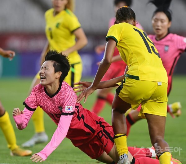 3일 경기도 화성종합경기타운에서 열린 ‘신세계 이마트 초청 여자축구국가대표팀 친선경기’ 한국과 자메이카의 경기에서 한국 손화연이 자메이카 수비와 몸싸움에 넘어지고 있다.