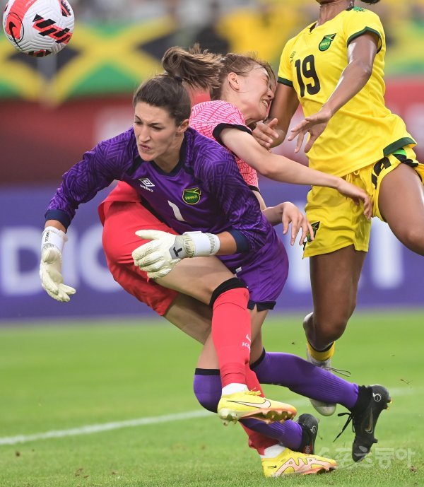 3일 경기도 화성종합경기타운에서 열린 ‘신세계 이마트 초청 여자축구국가대표팀 친선경기’ 한국과 자메이카의 경기에서 한국 강채림과 자메이카 슈나이더가 충돌하고 있다.