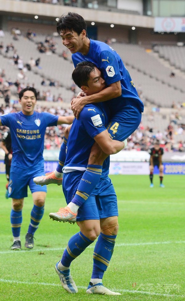 4일 서울월드컵경기장에서 열린 ‘하나원큐 K리그1 2022’ FC 서울과 수원 삼성의 경기에서 수원 오현규가 선제골을 성공시킨 후 동료와 기쁨을 나누고 있다.