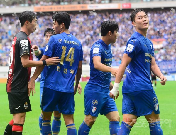 4일 서울월드컵경기장에서 열린 ‘하나원큐 K리그1 2022’ FC 서울과 수원 삼성의 경기에서 수원 오현규가 선제골을 성공시킨 후 서울 팬들 앞에서 세리머니를 하자 서울 박동진의 항의를 받고 있다.