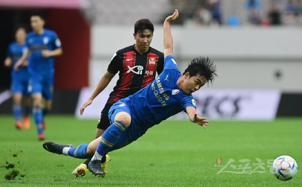4일 서울월드컵경기장에서 열린 ‘하나원큐 K리그1 2022’ FC 서울과 수원 삼성의 경기에서 수원 강현묵이 방향 전환을 하는 과정에서 미끄러지고 있다.