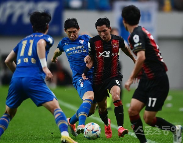 4일 서울월드컵경기장에서 열린 ‘하나원큐 K리그1 2022’ FC 서울과 수원 삼성의 경기에서 수원 장호익과 서울 임민혁이 몸싸움을 하고 있다.