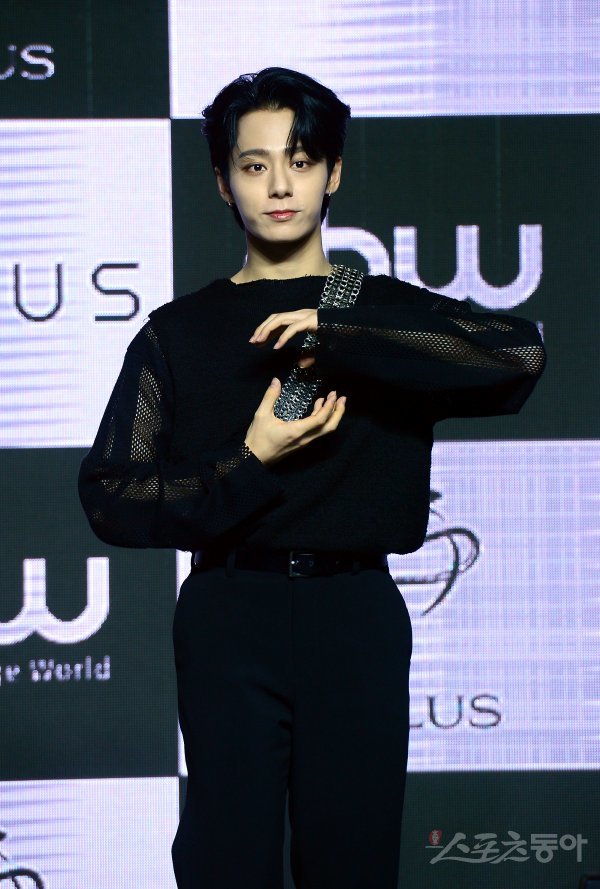 그룹 원어스(ONEUS) 환웅이 5일 서울 노원구 광운대 동해문화예술관에서 진행된 미니 8집 ‘MALUS’(말루스)‘ 쇼케이스에서 포토타임을 갖고 있다.