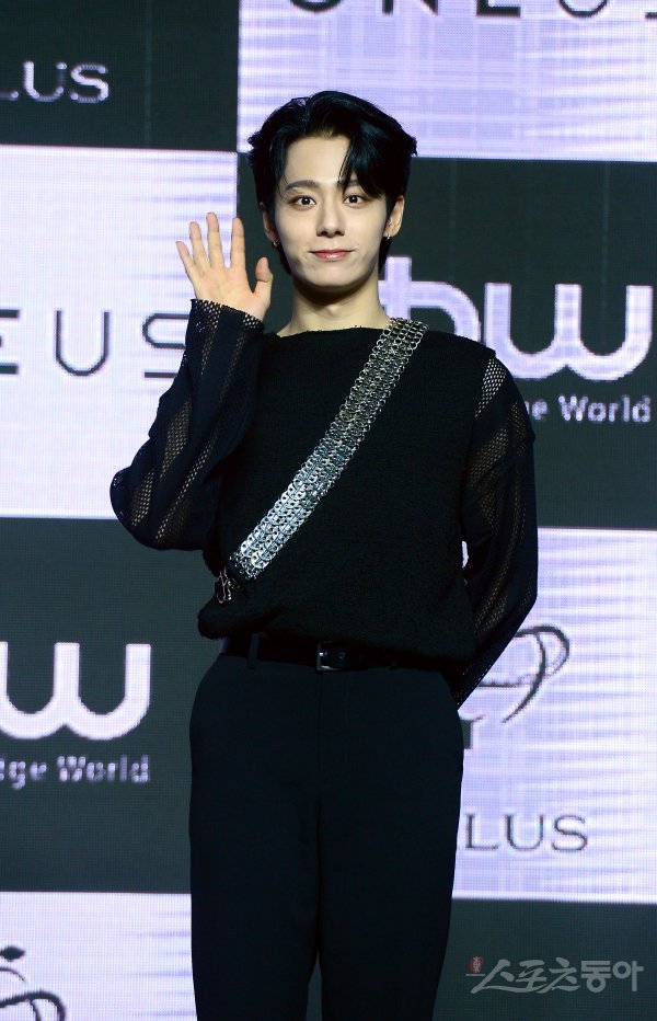 그룹 원어스(ONEUS) 환웅이 5일 서울 노원구 광운대 동해문화예술관에서 진행된 미니 8집 ‘MALUS’(말루스)‘ 쇼케이스에서 포토타임을 갖고 있다.