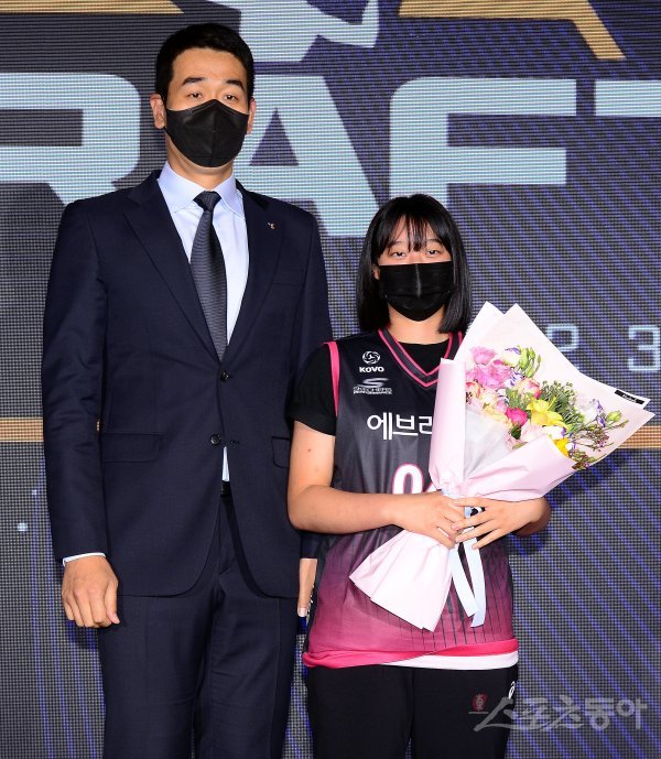 5일 서울 청담동 리베라호텔에서 ‘2022-2023 KOVO 여자 신인선수 드래프트’가 열렸다. 전체 12순위로 KGC인삼공사에 지명된 최효서가 고희진 감독과 기념촬영을 하고 있다.