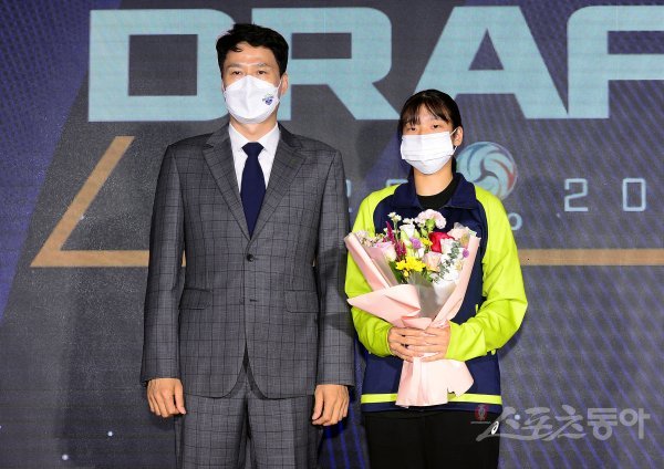 5일 서울 청담동 리베라호텔에서 ‘2022-2023 KOVO 여자 신인선수 드래프트’가 열렸다. 전체 8순위로 현대건설에 지명된 김사랑이 강성형 감독과 기념촬영을 하고 있다.