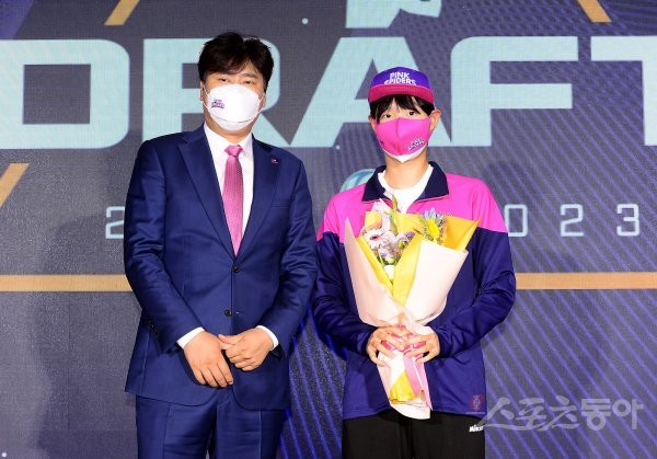 5일 서울 청담동 리베라호텔에서 ‘2022-2023 KOVO 여자 신인선수 드래프트’가 열렸다. 전체 2순위로 흥국생명에 지명된 임혜림이 권순찬 감독과 기념촬영을 하고 있다.