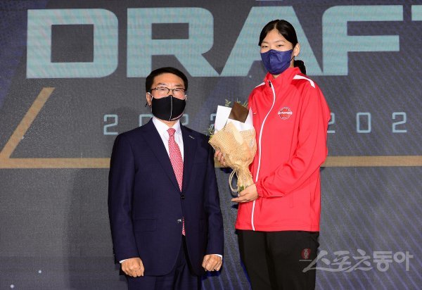 5일 서울 청담동 리베라호텔에서 ‘2022-2023 KOVO 여자 신인선수 드래프트’가 열렸다. 전체 1순위로 페퍼저축은행에 지명된 체웬랍당 어르헝이 김형실 감독과 기념촬영을 하고 있다.