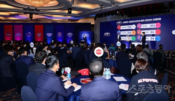 5일 서울 청담동 리베라호텔에서 열린 ‘2022-2023 KOVO 여자 신인선수 드래프트’에 참석한 7개 구단 관계자들이 드래프트를 지켜보고 있다.