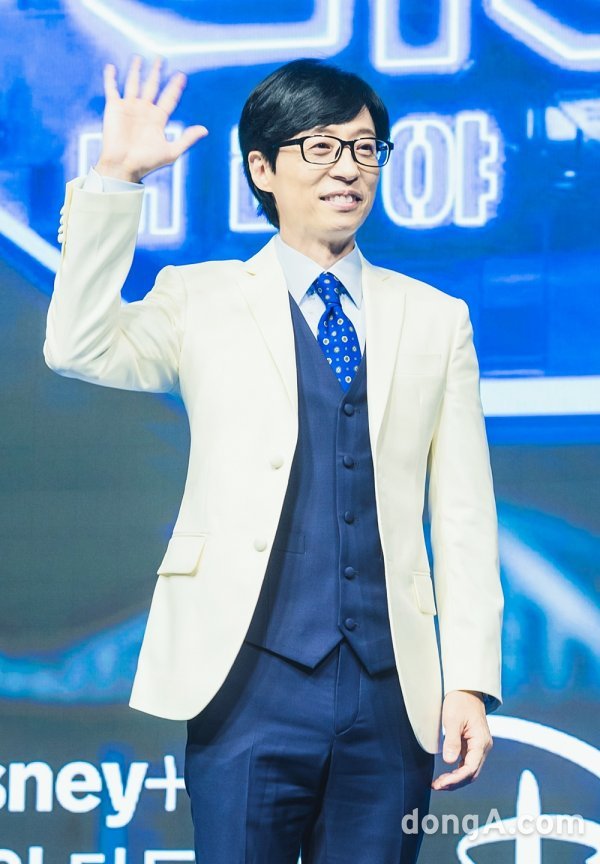 유재석이 6일 오전 진행된 디즈니+ 오리지널 예능 ‘더 존: 버텨야 산다’ 제작발표회에서 포즈를 취하고 있다.