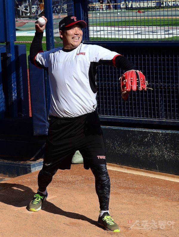 6일 서울 잠실야구장에서 ‘2022 신한은행 SOL KBO리그’ LG 트윈스와 SSG 랜더스의 경기가 열린다. 경기 전 LG 김현수가 불펜에서 투구를 펼치고 있다.