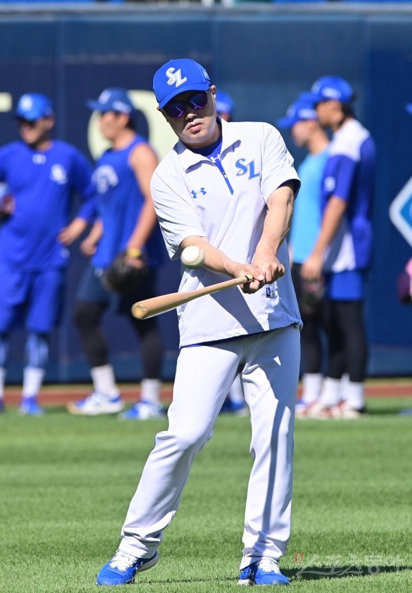 6일 대구 삼성라이온즈파크에서 열린 ‘2022 신한은행 SOL KBO리그’ 삼성 라이온즈와 키움 히어로즈의 경기에 앞서 삼성 박진만 감독대행이 볼 정리를 돕고 있다.