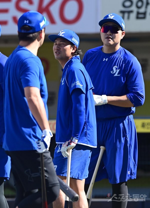 6일 대구 삼성라이온즈파크에서 열린 ‘2022 신한은행 SOL KBO리그’ 삼성 라이온즈와 키움 히어로즈의 경기에 앞서 삼성 김상수와 오재일이 동료와 이야기를 하고 있다.