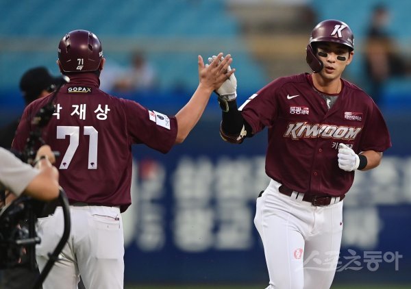 6일 대구 삼성라이온즈파크에서 열린 ‘2022 신한은행 SOL KBO리그’ 삼성 라이온즈와 키움 히어로즈의 경기에서 1회초 1사 1루 키움 이정후가 선제 우월 2점 홈런을 친 후 3루코치와 하이파이브를 하고 있다.