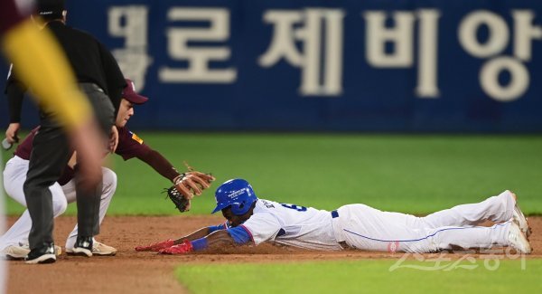 6일 대구 삼성라이온즈파크에서 열린 ‘2022 신한은행 SOL KBO리그’ 삼성 라이온즈와 키움 히어로즈의 경기에서 3회말 1사 2, 3루 삼성 피렐라가 동점 2타점 우전 적시타를 친 후 2루로 파고들어 세이프 되고 있다.
