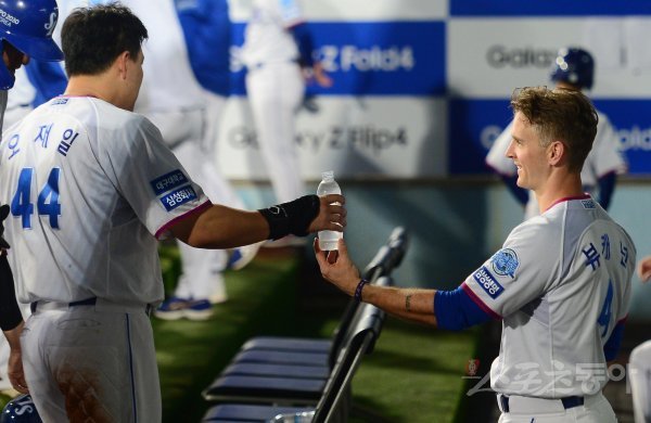 6일 대구 삼성라이온즈파크에서 열린 ‘2022 신한은행 SOL KBO리그’ 삼성 라이온즈와 키움 히어로즈의 경기에서 4회말 2사 만루 삼성의 우전 2루타 때 득점에 성공한 오재일에게 투수 뷰캐넌이 물을 주고 있다.
