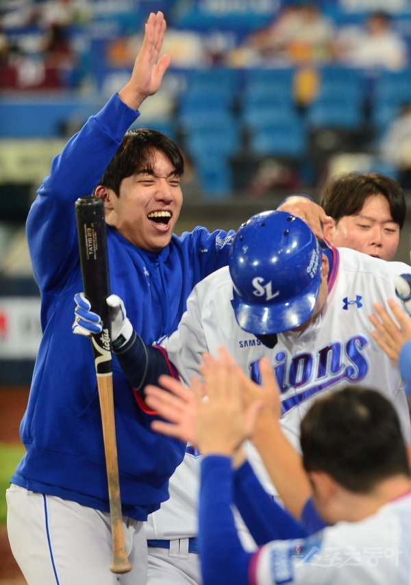 6일 대구 삼성라이온즈파크에서 열린 ‘2022 신한은행 SOL KBO리그’ 삼성 라이온즈와 키움 히어로즈의 경기에서 4회말 무사 삼성 김재성이 우월 솔로 홈런을 친 후 더그아웃 앞에서 원태인의 축하를 받고 있다.