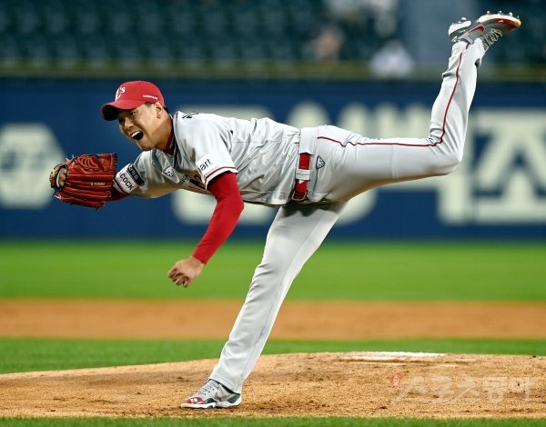 6일 서울 잠실야구장에서 ‘2022 신한은행 SOL KBO리그’ LG 트윈스와 SSG 랜더스의 경기가 열렸다. SSG 선발투수 김광현이 힘차게 볼을 던지고 있다.