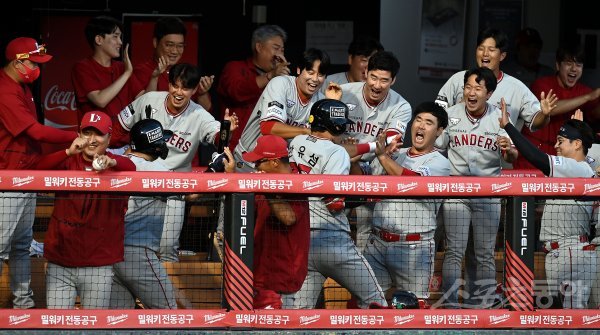 6일 서울 잠실야구장에서 ‘2022 신한은행 SOL KBO리그’ LG 트윈스와 SSG 랜더스의 경기가 열렸다. 2회초 1사 1루에서 SSG 한유섬이 투런 홈런을 쏘아 올린 후 동료들의 환영을 받고 있다.