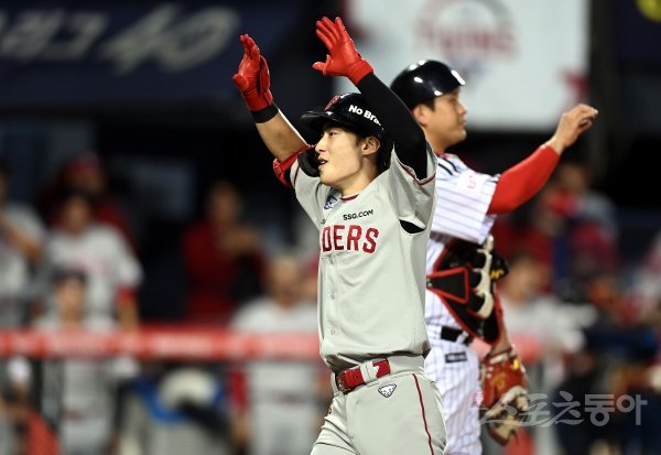 6일 서울 잠실야구장에서 ‘2022 신한은행 SOL KBO리그’ LG 트윈스와 SSG 랜더스의 경기가 열렸다. 3회초 1사 1루에서 SSG 최지훈이 투런 홈런을 쏘아 올린 후 그라운드를 돌며 환호하고 있다.