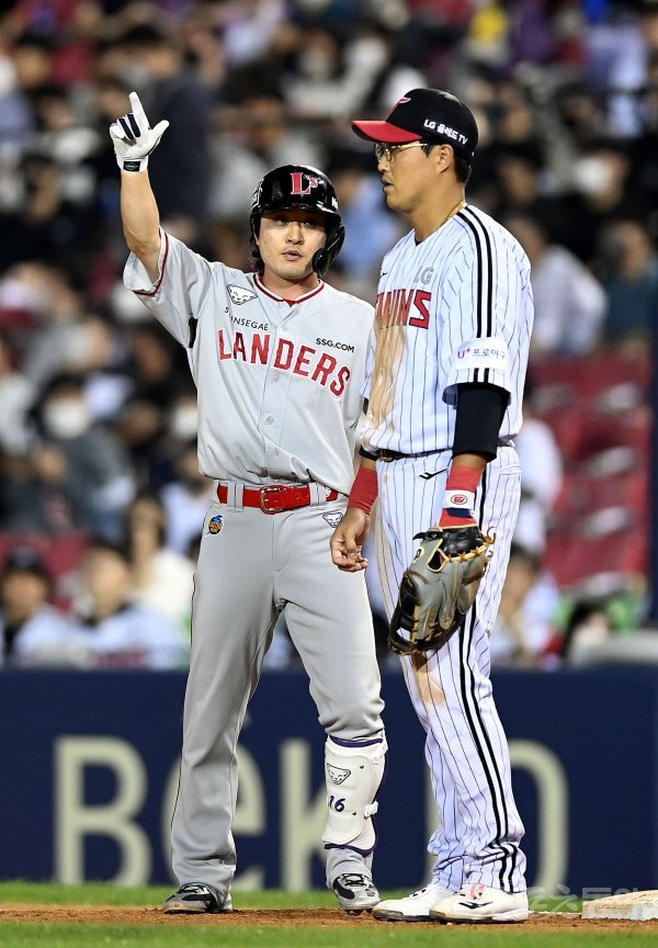 6일 서울 잠실야구장에서 ‘2022 신한은행 SOL KBO리그’ LG 트윈스와 SSG 랜더스의 경기가 열렸다. 4회초 무사 2, 3루에서 SSG 김성현이 1타점 적시타를 날린 후 세리머니를 펼치고 있다.