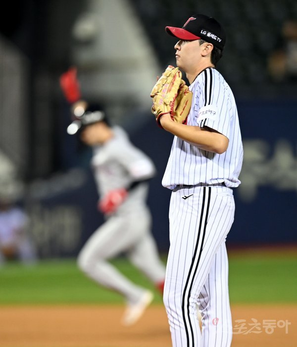 6일 서울 잠실야구장에서 ‘2022 신한은행 SOL KBO리그’ LG 트윈스와 SSG 랜더스의 경기가 열렸다. 3회초 1사 1루에서 홈런을 허용한 LG 선발 이민호가 아쉬워하고 있다.