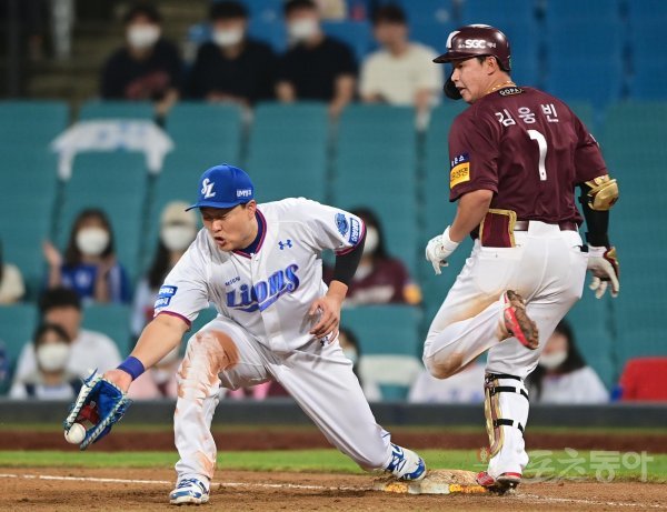 6일 대구 삼성라이온즈파크에서 열린 ‘2022 신한은행 SOL KBO리그’ 삼성 라이온즈와 키움 히어로즈의 경기에서 6회초 2사 1루 키움 김웅빈의 내야 안타 때 삼성 1루수 오재일이 송구된 볼을 놓치고 있다.