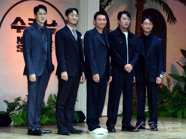 7일 서울 역삼동 조선팰리스 서울강남에서 열린 넷플릭스 ‘수리남’ 제작발표회에 참석한 유연석, 박해수, 황정민, 하정우, 조우진이 포즈를 취하고 있다.